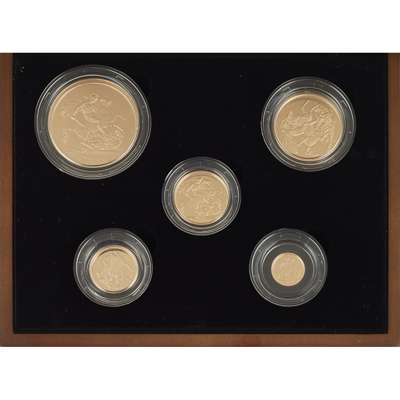 in case with booklet, comprising; £5, double sovereign, sovereign, half sovereign, quarter sovereign, all as issued