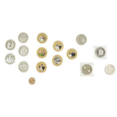 in case, as minted, together with Lest We Forget, five silver £5 coins with certificates and box; six gilt base metal crowns 2007; three other crowns; Britannia silver proof coin, all as issued (qty)