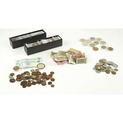 two cartwheel pennies; halfpennies, Belgian and other European bronze coinage; Maria Theresa Thaler; various crowns 1902; 1937; 1845; 1821; 1899; 1935; half crown 1887, other modern base metal crowns; commemorative crowns; various mixed bags 20th century; some pre 47 silver; an album of mixed coins, generally poor condition; two card coin boxes individual European coins, mainly 20th century; Irish pre 47 silver; some French silver; 5Fr 1834; 1875; 1867; 1868; 1870; 1869; USA, 50c 1833; $1 1889; 1925