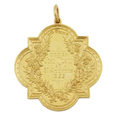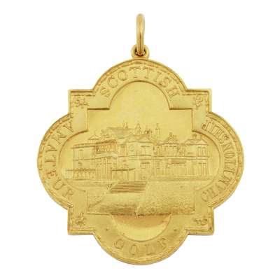 Walker and Hall 1922, 22ct gold, the medal of square form with demi-lune sides, decorated with a view of the R&A St Andrews and Scottish Amateur Golf Championship to the border, the reverse with frame of thistles enclosing the engraved winner John Wilson at St Andrews 1922, in box of issue, with various period photographs and press cuttings;