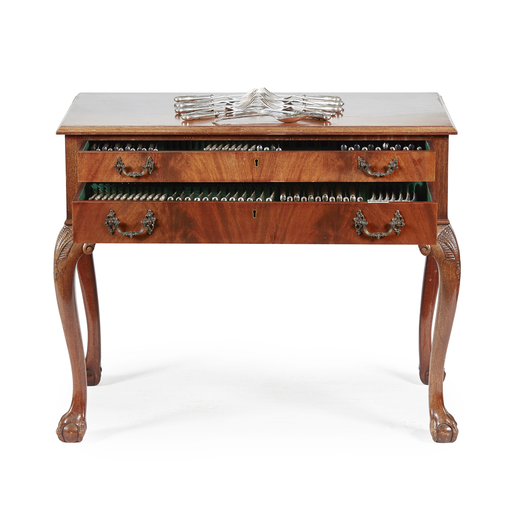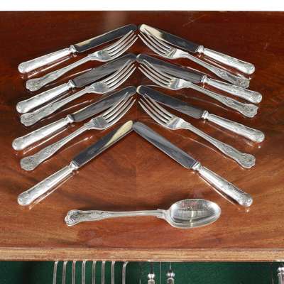 Walker & Hall, comprising twelve of each; table knives, second course knives, table forks, dessert forks, dessert spoons, soup spoons, fish knives and forks; thirteen side knives, ten of each fruit knives and forks, eight table spoons, ten various serving pieces; various small dessert pieces, coffee spoons etc. (qty)