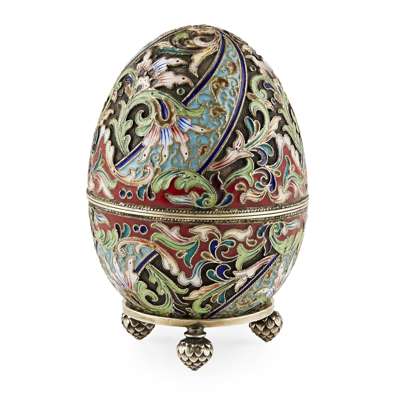 St Petersburg circa 1900 and bearing Cyrillic mark for maker, the egg divided, and decorated in coloured enamels, similar palette to Theodore Ruckert, all on a small circular frame with conical leaf clasped feet