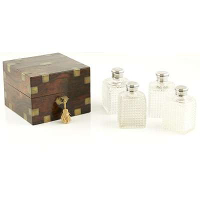 the silver screw-off covers decorated with engine turning, unmarked, each square facetted bottle with pull out stopper, contained in fitted base, velvet lined brass bound box, with blank escutcheon and a key