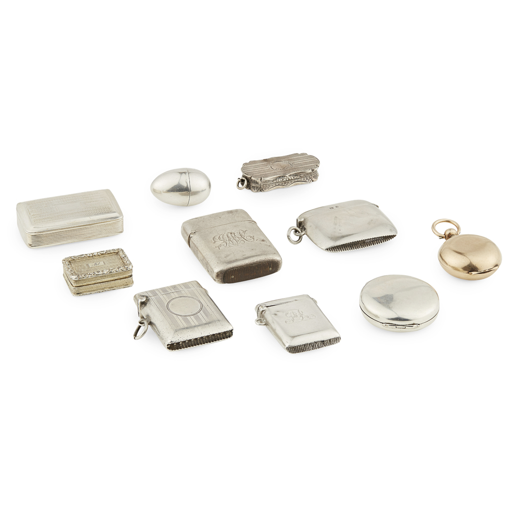 four various vesta cases, similar engraved decoration, early 20th century, ring attachments; a small circular patch box and cover, gilt interior; a rolled gold sovereign keeper; a George III egg shaped nutmeg grater by Thomas Willmore; two vinaigrettes, one by Thomas Smith, cast border and engine turned decoration, another by Nathaniel Mills, slight serpentine rectangular form, and a George III snuff box by Nathaniel Mills, plain rectangular form (10)
