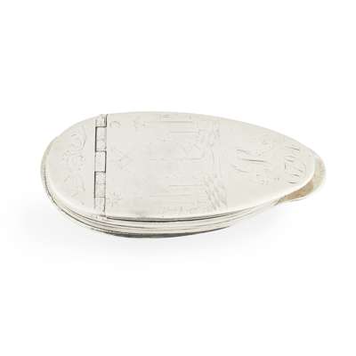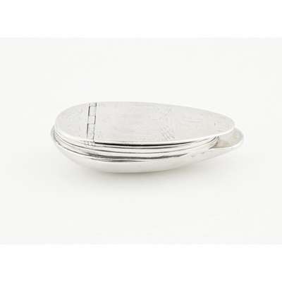 apparently unmarked, modelled as a mussel, plain shaped base, the conforming hinged lid with hidden hinge, and engraved various Masonic symbols and dated 1794 with the initial R