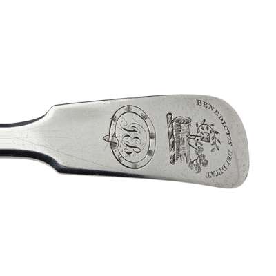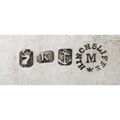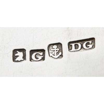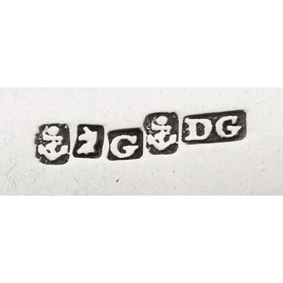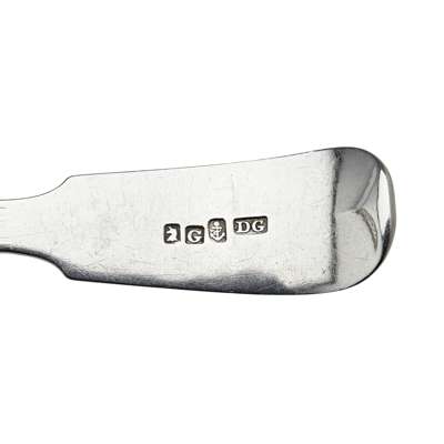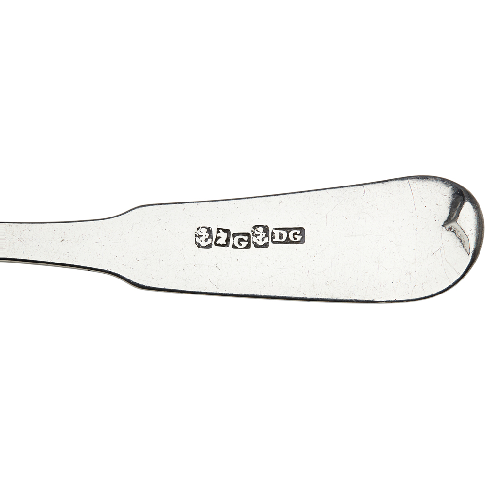 David Gray, marked anchor, unicorn, G, anchor, DG, foliate Q to terminal; marked unicorn, G, anchor, DG, crest and initials to terminal, both of Fiddle pattern; together with Joseph Pearson & Mark Hinchscliffe marked e, stag, anchor, JP, italic H engraved to terminal; marked stag, K, anchor, Hinchcliffe M, Gothic D engraved to terminal, both of Fiddle pattern (4)