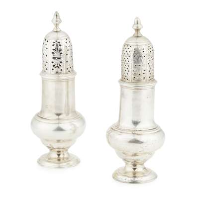 Adam Graham, Glasgow circa 1765, of baluster form, fully pierced domed pull off lid to one, the other partially pierced, acorn finial, raised on a stepped domed foot (2)