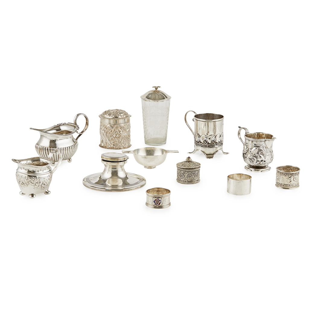 to include; a modern Scottish silver quaich; feature hallmarks for Edinburgh 1990; a capstan inkwell, WN, Birmingham 1916, threaded detail, plain; a Victorian trinket box and cover, William Comyns, embossed floral detail with birds, pull off cover, three napkin rings, one with enamel detail; three various cream jugs; an Edwardian tea glass holder, Levi and Salaman; a small foreign white metal box and cover (qty)