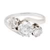 claw set with a cushion-cut diamond, flanked to either side by an old round-cut diamond, to a plain 18ct gold shank