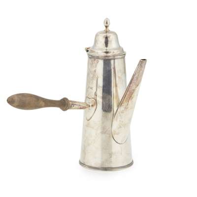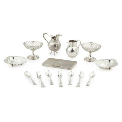to include a set of twelve pastry forks and twelve teaspoons, Cooper Brothers & Sons Ltd, Sheffield 1958, of double struck King's pattern; together with a pair of shell butter dishes, London 1921, a pair of bon-bon dishes, two milk jugs, a cigarette case and a silver on copper coffee pot (qty)