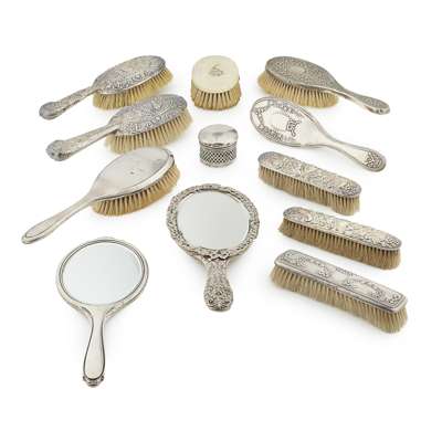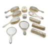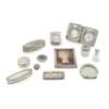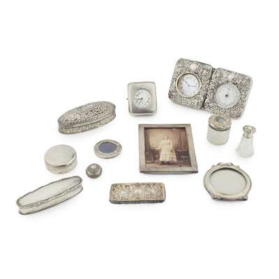 to include various hair and clothes brushes, mirrors, silver mounted dressing table boxes, cased travel clocks, photo frames and dressing table boxes (qty)