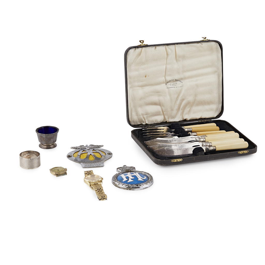 a WMF Art Nouveau style vase, embossed rose decoration, cased set of tea knives, teaspoons and tongs, cake servers, caddy spoon, table spoon, ladle, fish knives and forks etc. AA and RAC badge, silver mounted conductor's baton, cased carving set (qty)