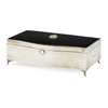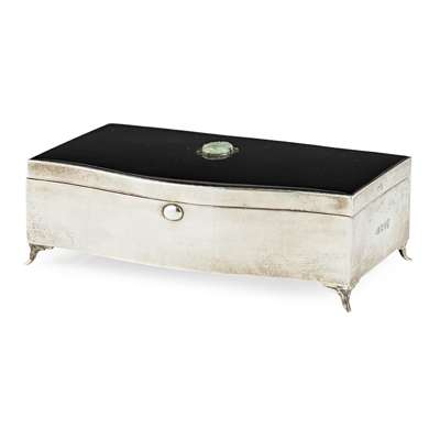 Albert Carter, Birmingham 1935, (jubilee mark), of rectangular form, slight domed hinged cover with black enamel ground and an onset small pierced and carved jade panel, serpentine front, velvet lined interior and all raised on slight French feet