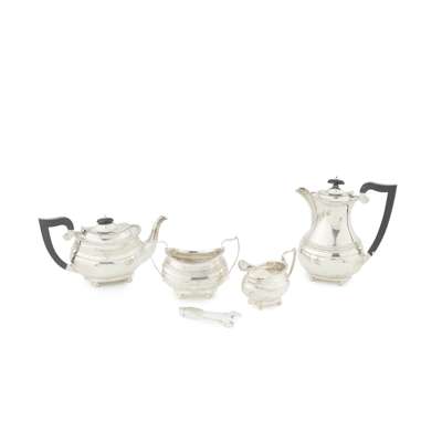 Adie Brothers Ltd., Birmingham, comprising water pot, teapot, twin handled sugar bowl and milk jug, all of oval form, gadroon border, ribbon border, all raised on four ball feet; together with a plated pair of tongs (5)