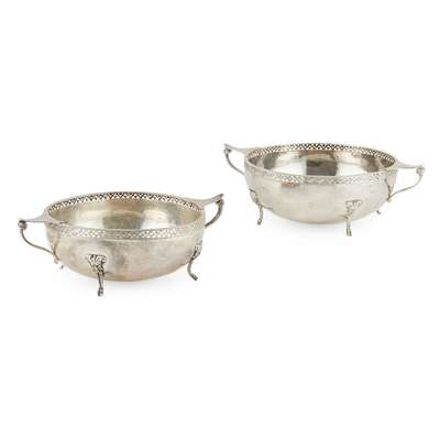 Albert Edward Jones, Birmingham 1925 and 1945, of round form, projecting lug handles, reticulated rose and ribbon decorated border, planished hemispherical body, all on Bacchus mask and hoof feet