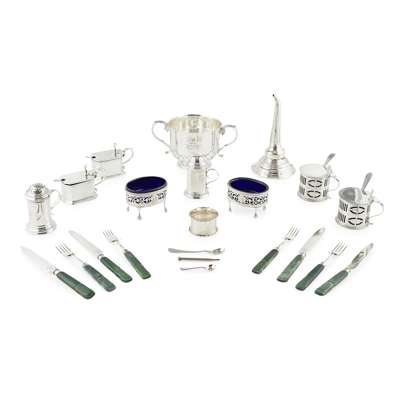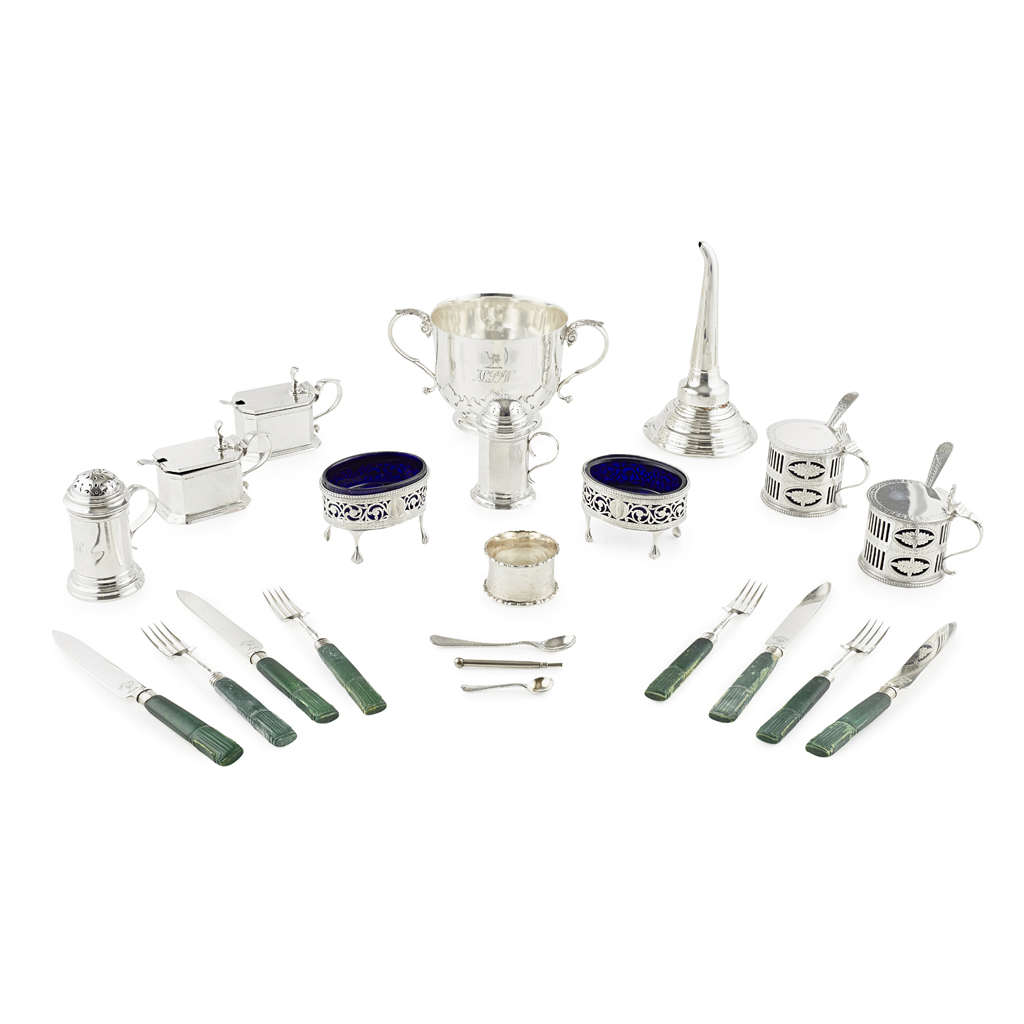 to include, a twin handled porringer of plain design, cut card design to the lower section, engraved crest and monogram; a pair of Georgian style oval salts, with liners, a similar pair of mustard pots and covers with liner; a four piece Art Deco style condiment set of angular form; a set of Georgian fruit knives and forks with stained ivory handles, silver blades and tines (qty)
