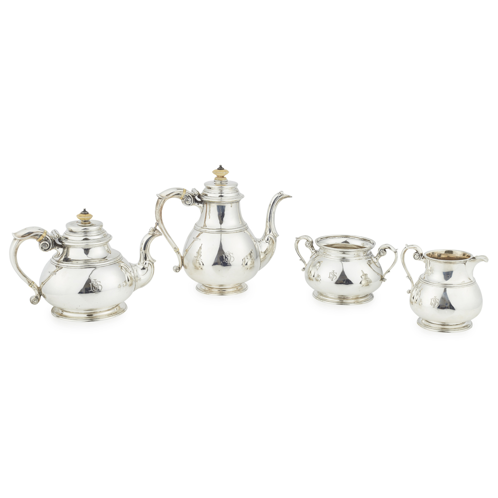 Goldsmiths & Silversmiths Co. Ltd, London 1920, comprising coffee pot, teapot, twin handled sugar bowl and milk jug, all of circular squat form, ribbed border, S scroll handle, engraved initials to body (4)
