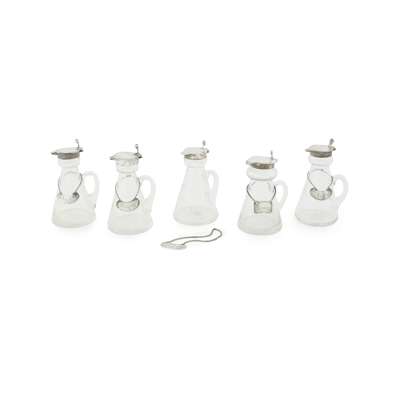 Hukin & Heath Ltd, Birmingham various dates of typical form, with star cut base, plain flat hinged cover and thumb-piece; all with various spirit labels inscribed WHISKY; together with two similar, London (5)