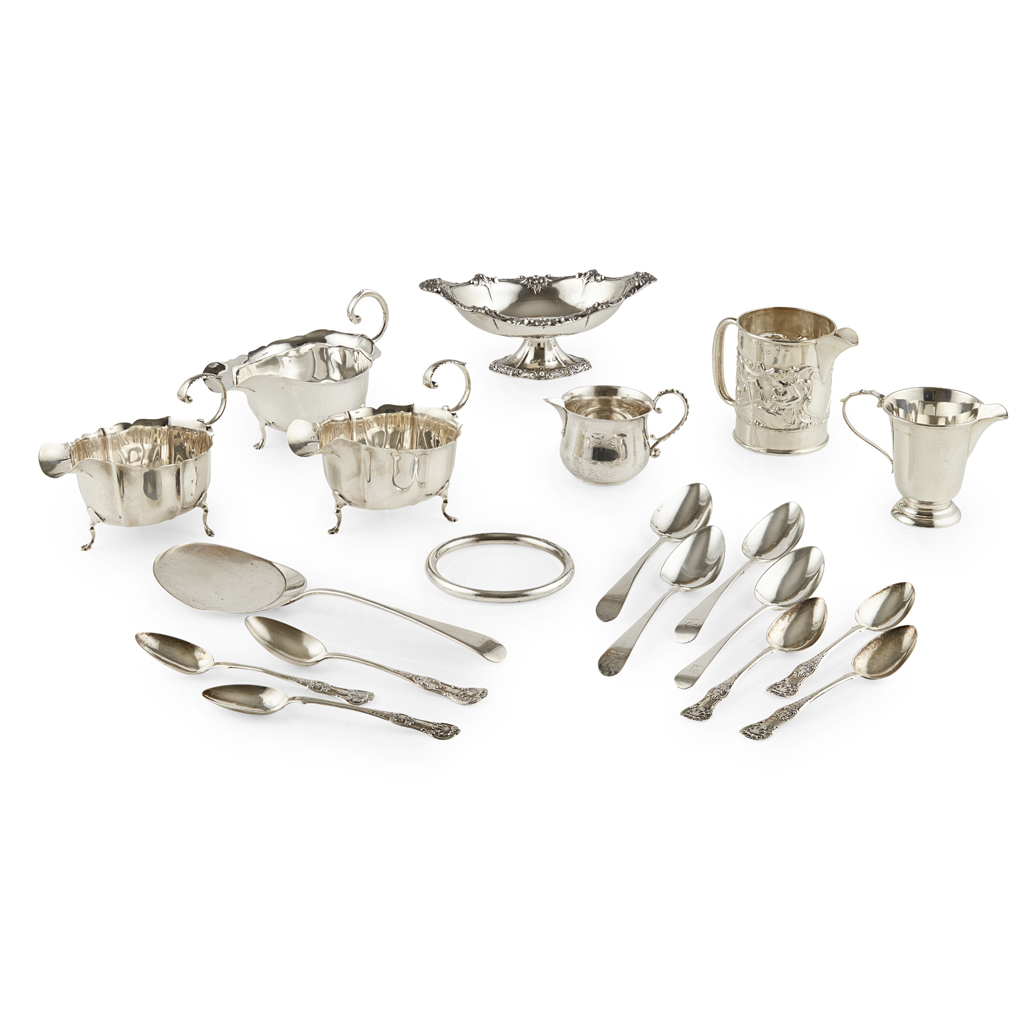 two various small cream jugs, a pair and single sauce boats, all first half 20th century; four various George III dessert spoons; a set of six Victorian teaspoons, single struck Queen's pattern; a small pedestal sweetmeat basket, floral decoration; a cake slice; a bangle (qty)