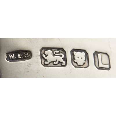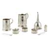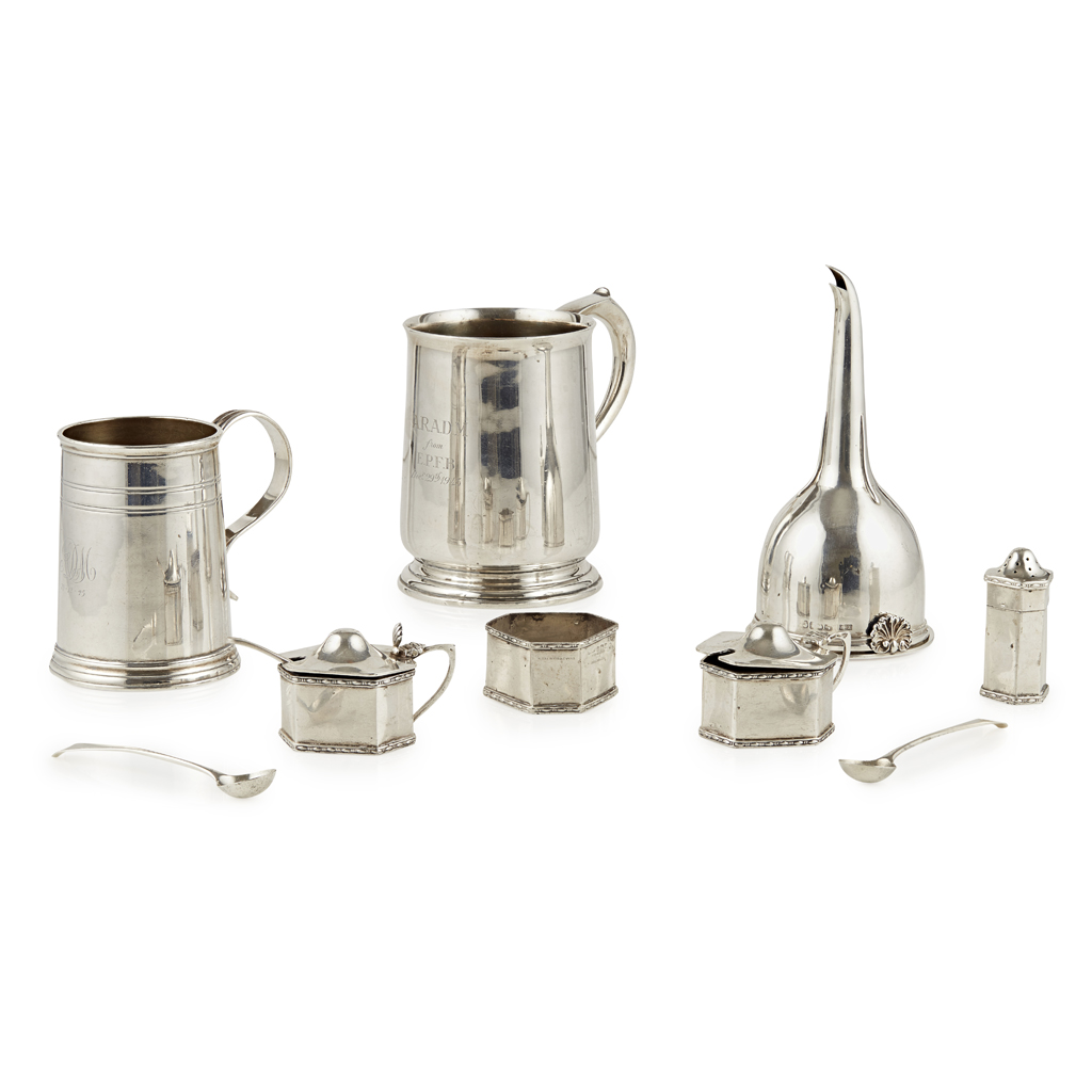 a George III style half pint mug, Mappin and Webb, London 1919, of plain tapering form, engraved threaded bands , monogram and dated, moulded handle; a pint mug, WEB, London 1946, of plain can form, engraved initials and dated; a four piece Art Deco style condiment set; a Victorian wine funnel of conventional form