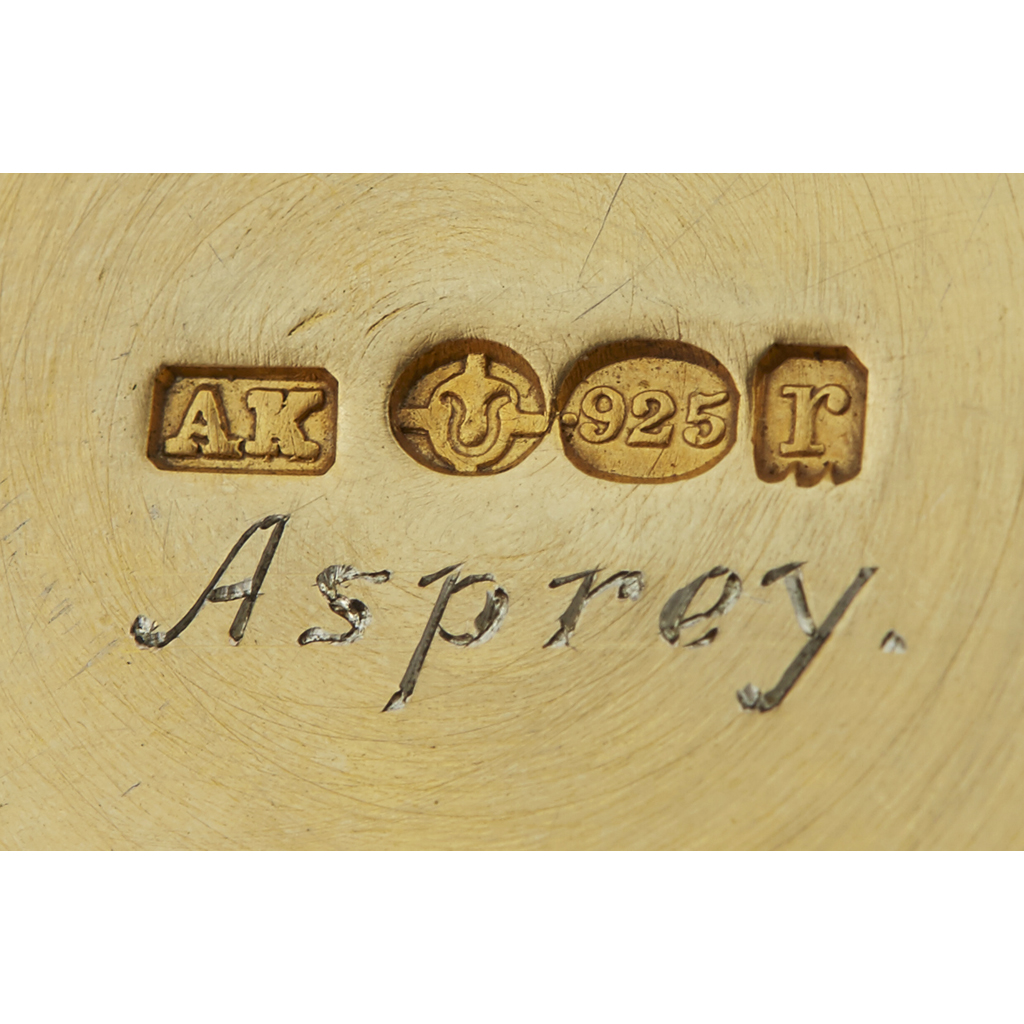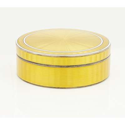 Asprey (Retailer), AK, and import mark for 1912, of circular form, all over guilloche enamel in imperial yellow enamel with simple white enamel borders, gilt interior