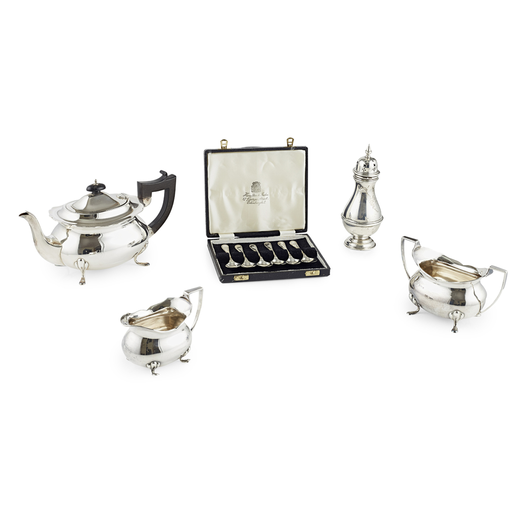 CTB, Birmingham 1912, of rounded oval form, plain, angular composite handle to the teapot, all on plain cabriole legs with a sugar caster of plain baluster form and a cased set of spoons (qty)
