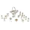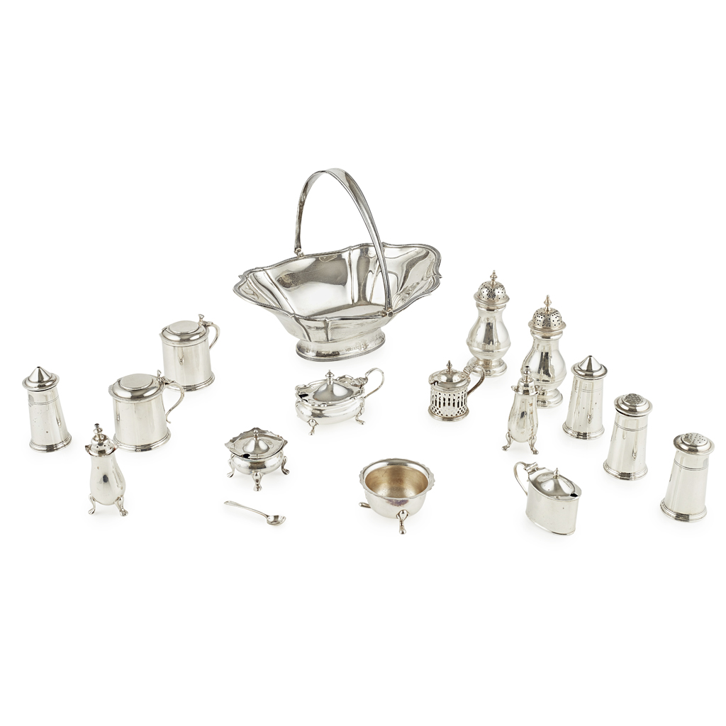 the basket Dixon and Sons, Sheffield 1904, of lobed oval form, threaded border, swing handle and raised on a collar foot; an Art Deco set of condiments, E Viner, Sheffield 1946, of plain drum form, comprising a pair of lidded mustards, a pair of salts and peppers, plain slight threaded detail; a pair of baluster pepperettes moulded border, spreading foot; three various mustard pots and covers and another part set (qty)