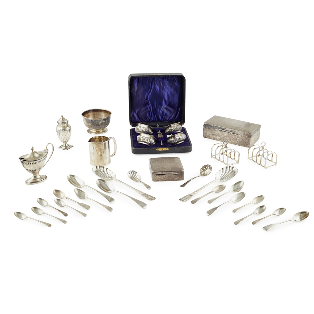 to include; cream jug and sugar bowl; pair of toast racks; two caddy spoons; two cigarette boxes; pepper pot; mustard pot; collection of flatware; cased set of condiments; cased set of mother of pearl fruit knives (qty)