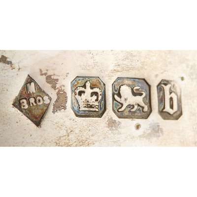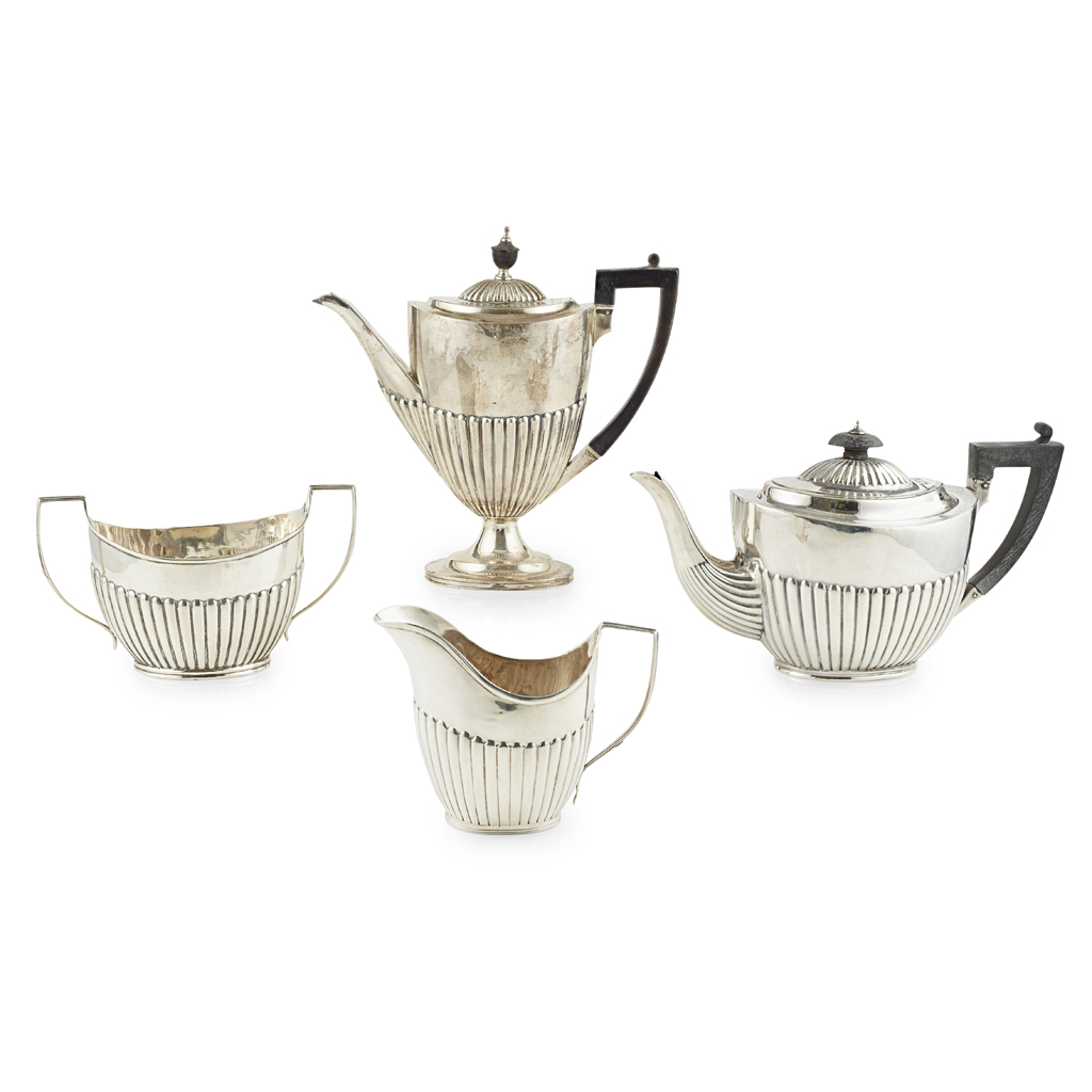 London 1890 and the coffee pot Sheffield 1894, of oval form, demi ribbed, engraved crest and motto, angular composite handles and reeded, all on oval bases (4)