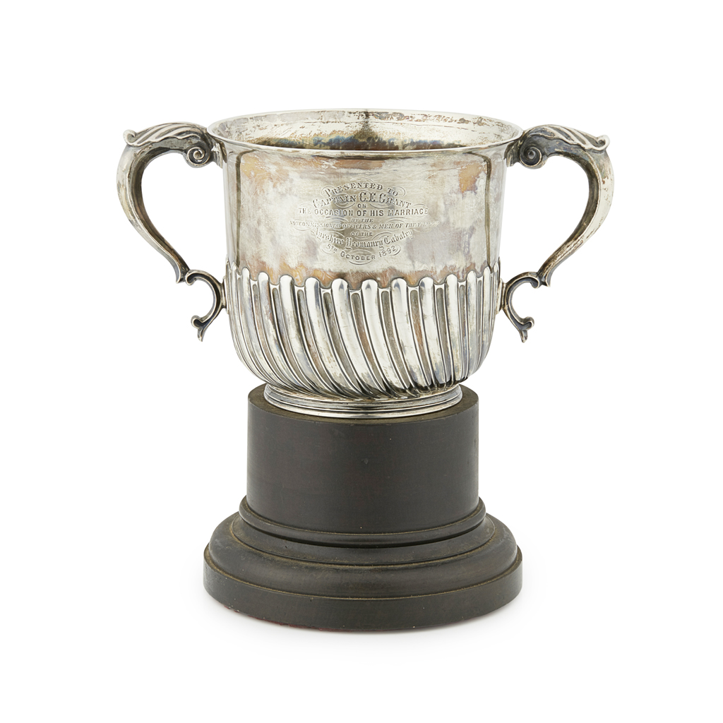 Thomas Bradbury & Sons, London 1892, with gadrooned detail to lower body, presentation inscription, on a turned wooden base
