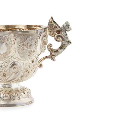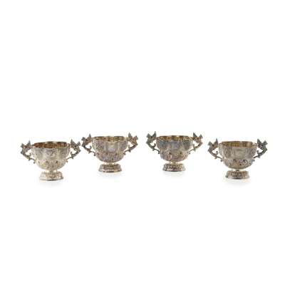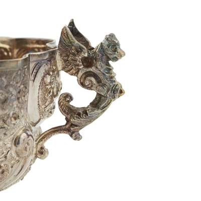 James Wakely & Frank Clarke Wheeler, retailed by Edward & Sons, London 1892, of ornate foliate design, cast griffin handles, in a fitted box with purple velvet lining