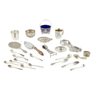 to include: a Georgian style sugar basket with engraved and pierced decoration, glass liner; a silver christening mug; sugar bowl; Armada dish; spoons; napkin ring; plated wick trimmers; presentation trowel; mirror; etc. (qty)