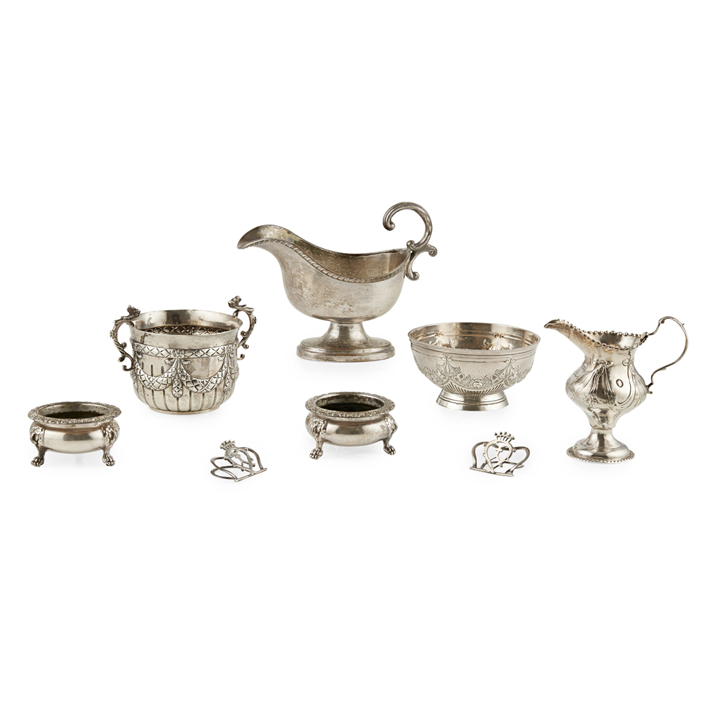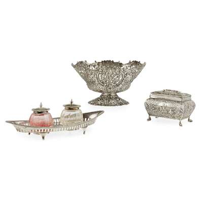 to include; a Victorian twin handled bowl with floral swag detail, London 1892, another sugar bowl with floral detail, two menu card holders; a Dutch silver basket import marks for Berthold Muller, of oval shape, reticulated sides and foot; an elongated oval inkstand with two glass inkwells; a 19th century Dutch tea caddy, import marks for 1893; plated sauce boat, salts and cream jug (qty)