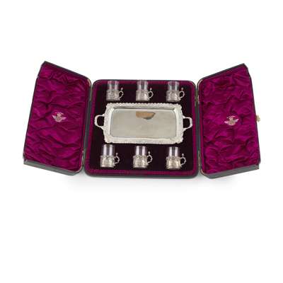 the tray Henry Atkins, Sheffield 1891, the glass holders William Comyns, Birmingham, comprising a tray and six silver mounted glasses, in a fitted box with a purple velvet lining with gilt trade label for George Edwards of Glasgow and London