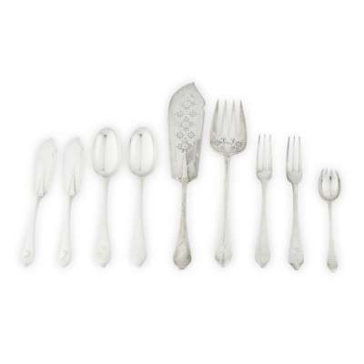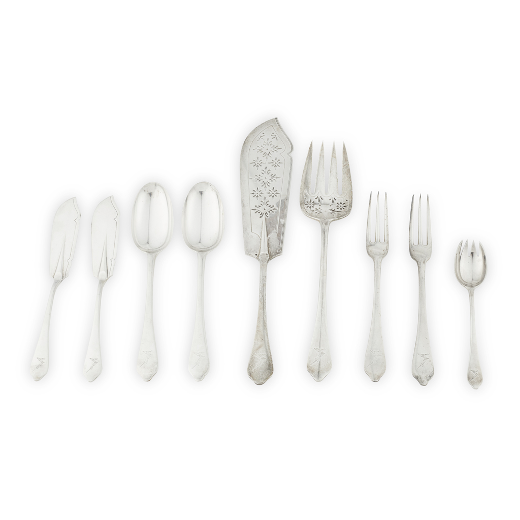Francis Higgins, London 1880, comprising twelve table forks, eight tablespoons, a pair of pierced fish servers, a fruit spoon, two fish knives, of plain Dog-nose pattern, rat tail bowls, engraved crest to terminals (25)