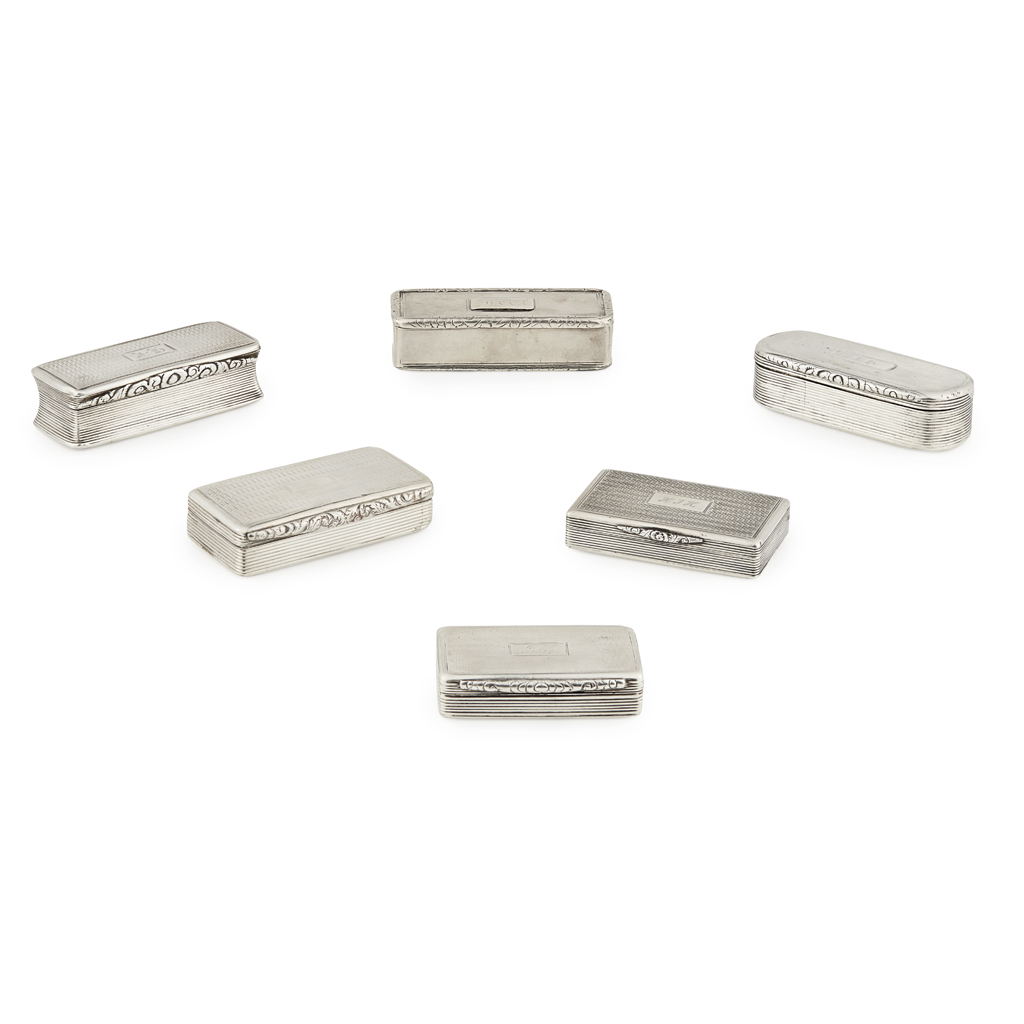 all Birmingham assayed, a rectangular box, Edward Smith, 1827, of rectangular form, cast thumbpiece, engine turned decoration; two similar narrow rectangular boxes, Joseph Taylor and another London made box similar size, engine turned decoration size; another of similar size, rounded ends, Thomas Willmore, cast thumb piece; two rectangular boxes, engine turned decoration cast thumbpieces and gilt interior (6)
