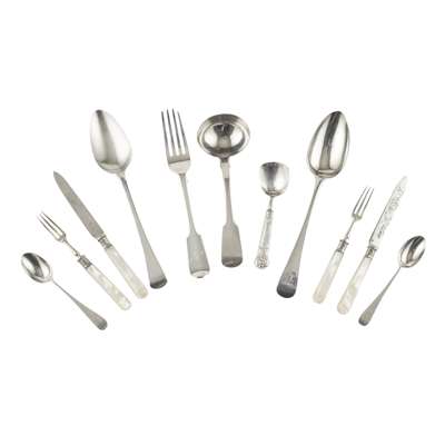 to include; a set of nine Old English pattern teaspoons; a George III caddy spoon, John Thornton, Birmingham 1826, shovel shaped bowl, filled handle; a gravy ladle, fiddle pattern; five various 19th century table spoons and a table fork; six mother of pearl fruit knives and forks, silver blades and tines (qty)