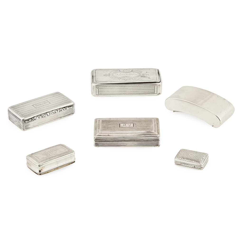 the vinaigrette John Shaw, Birmingham 1815, of small rectangular form, wriggle work decoration, simple pierced grill; a curved snuff box, plain, Thomas Taylor, Birmingham 1805, hinged lid to the inner curve; another rectangular form, Birmingham, circa 1810, engine turned decoration, stepped border; another slightly smaller Thomas Shaw, Birmingham 1835, engine turned decoration, engraved name, cast thumb piece, reeded sides; another smaller John Wilkinson, Birmingham 1840, scrolling leaf engraving to the hinged cover, reeded edge; another larger table snuff box, possibly Thomas Shaw but with French control marks, engraved inscription (6)