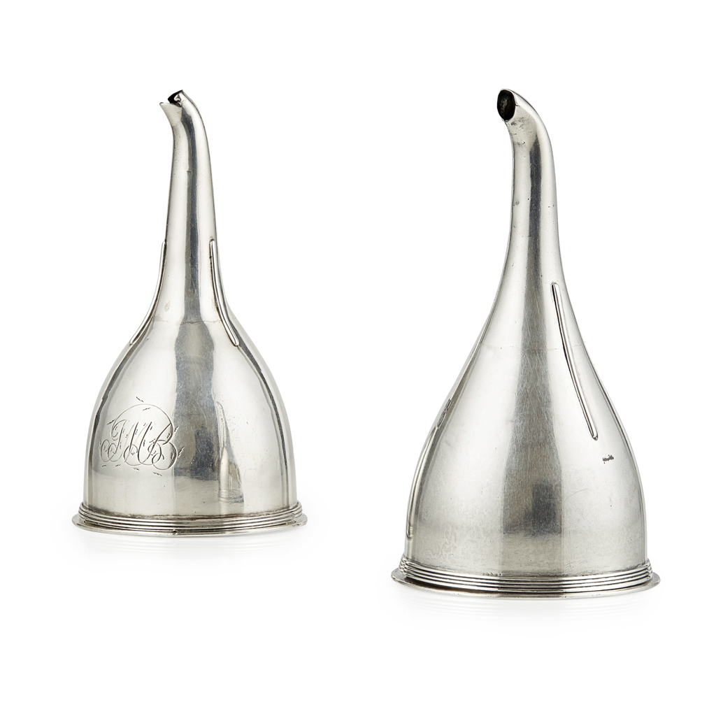 John Emes, London 1803, of conventional form, threaded border, removable strainer, plain body, engraved monogram, strengthening staves; another wine funnel, London 1803, similar to previous (2)