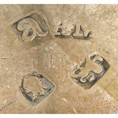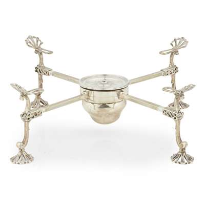 Richard Mills, London 1776, of traditional form, central burner, engraved crest, four radiating arms, shell sliding terminals and matching feet