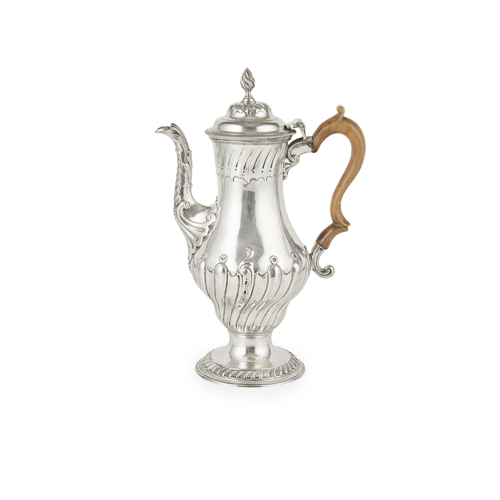 John King, London 1774 of baluster form, demi-wrythen luted body, leaf clasped spot, acorn finial, wooden, scroll handle, raised on a spreading domed foot with gadrooned rim