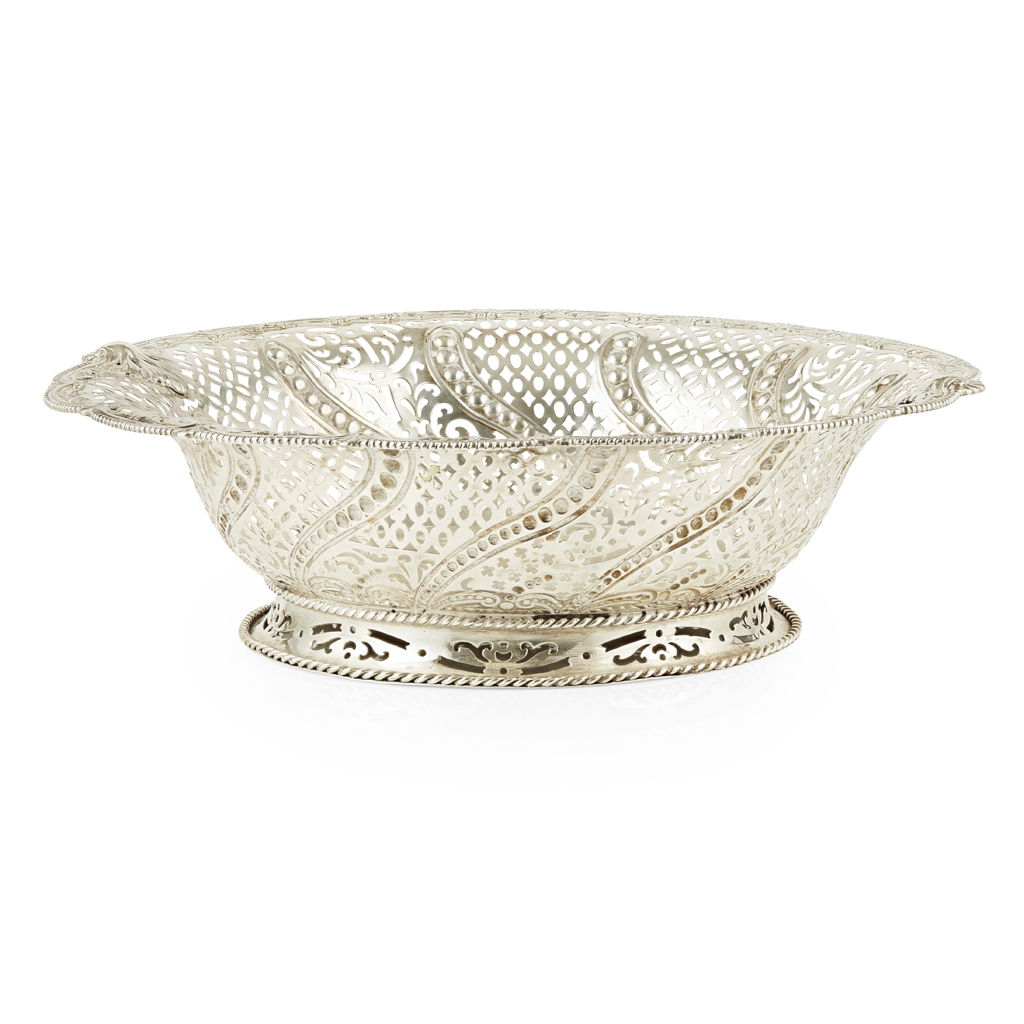 Emick Romer, London 1769, of round form, slight serpentine beaded border, the whole with reticulated panels, and divisions of tapering bands of beads, the base engraved stag crest on bold floral ground, pierced circular foot