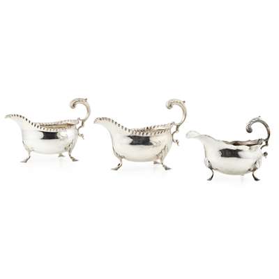William Skeen, London, 1762, each oval on three hoof feet, foliate scroll handle and with crimped rim; together with another smaller, circa 1750, oval on three shell-capped hoof feet (3)