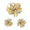 of stylised foliate design, each composed of textured leaves, and at intervals with pavé set eight-cut and old round-cut diamond set leaves, brooch indistinctly marked to pin, earrings with post and clip fittings, also indistinctly marked (2)