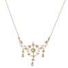 of pierced scrolling design, set throughout with seed pearls, round and pear shaped peridots, to an integral trace link chain, stamped 9ct