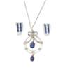 of pierced circular design set throughout with small eight-cut diamonds, suspending two oval and pear shaped sapphire drops, to a 9ct gold trace link chain; together with a pair of earrings, each channel set with princess-cut diamonds and square-cut sapphires, post and clip fittings, stamped 750 (2)