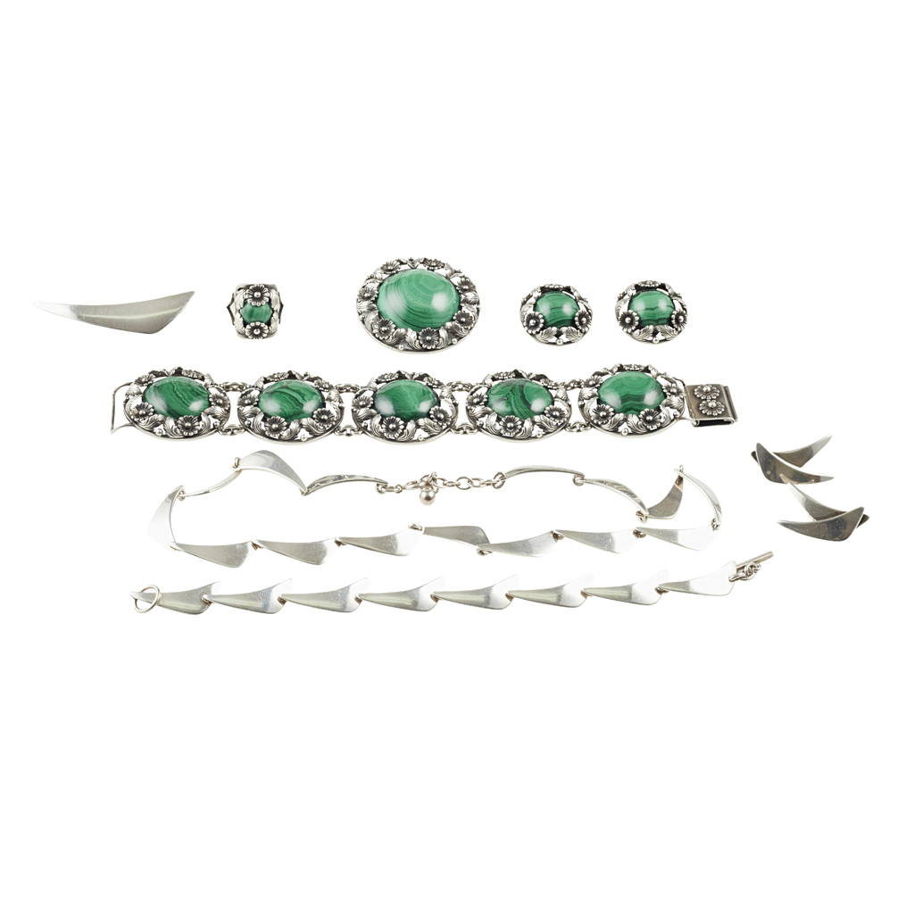 the first comprising a bracelet, earrings, ring and brooch; each composed of circular links set with a malachite cabochon in a floral border, stamped STERLING DENMARK N.E.FROM 925S; second suite comprising a necklace, bracelet, brooch and earrings, composed of plain curved links, STERLING DENMARK N.E.FROM 925S (qty)