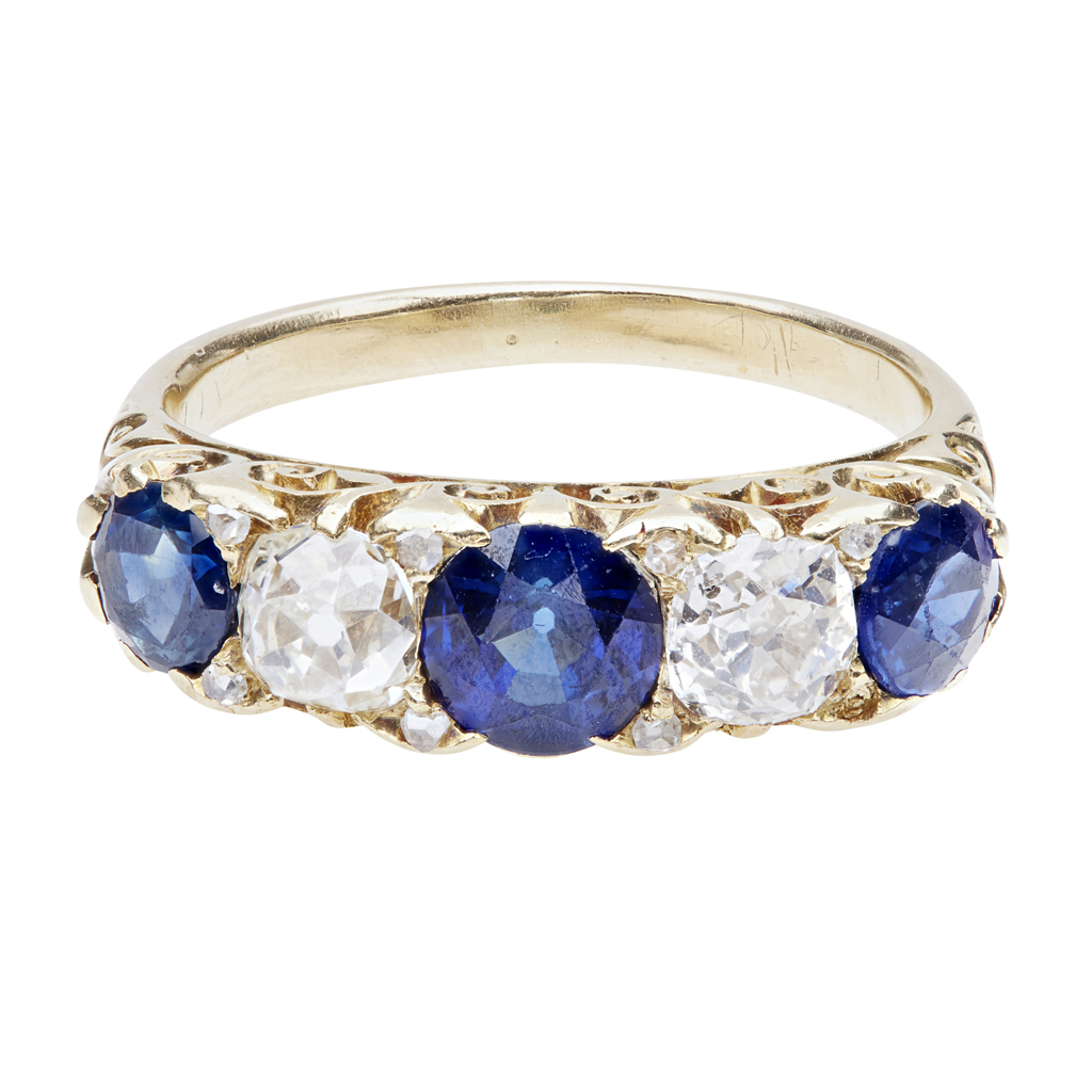 claw set with two old-round cut diamonds, between three graduated round cut sapphires, scrolling detail to the gallery, to a plain yellow metal shank, unmarked