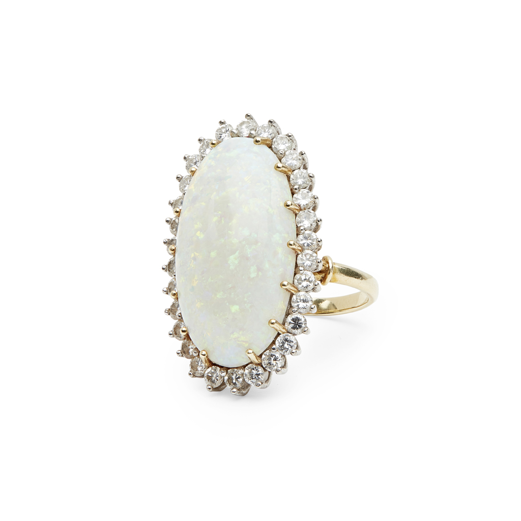 claw set with an oval opal cabochon, in a border of round-brilliant cut diamonds, to an 18ct yellow gold shank