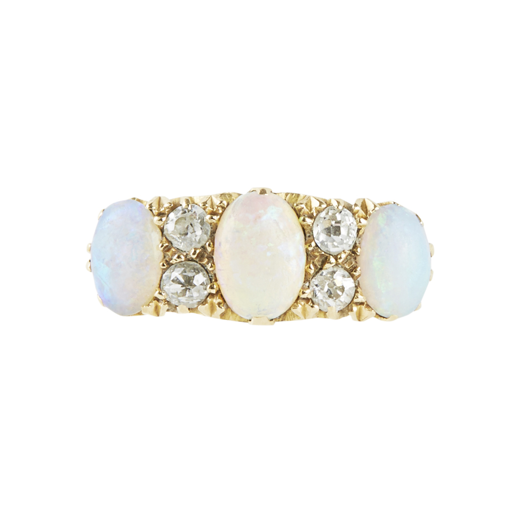 claw set with three oval opals, between pairs of old-round cut diamonds, scrolling detail to the gallery, plain shank
